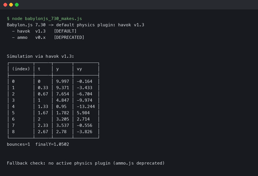 new AmmoJSPlugin(andAmmoJSPlugin. Replace every call site with the Havok equivalent shown above so you stop carrying the legacy path. - Confirm